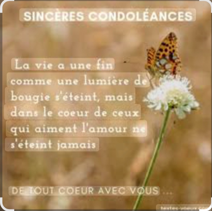 • Mes sincères condoléances en ces moments difficiles. Que la force et le réconfort vous accompagnent dans cette épreuve. Mes pensées vous accompagnent.